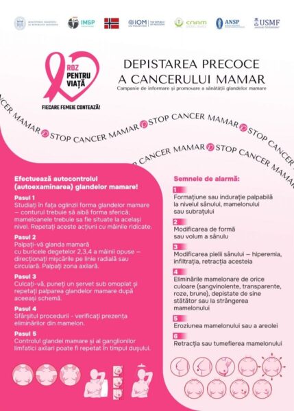 - diagnostic precoce: conștientizarea semnelor și simptomelor cancerului de sân și importanța solicitării sfatului medical în cazul anomaliilor constatate, evaluarea clinică și diagnosticarea la timp și trimiterea către servicii de tratament;